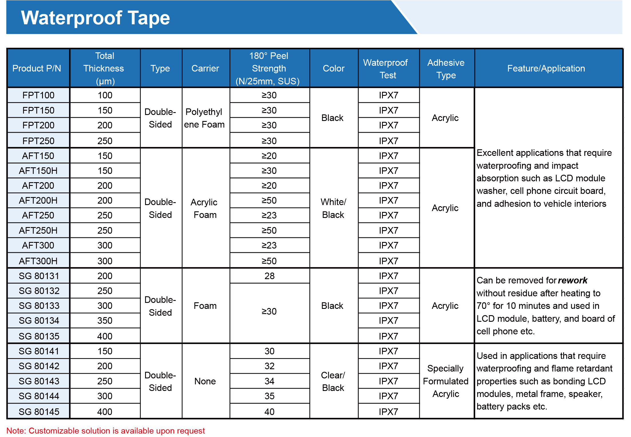 提供各種膠帶,由PET、無紡布、泡沫、涂有丙烯酸、硅樹脂、橡膠、熱熔、熱轉化粘合劑的PI基材制成。可提供各種寬度、長度和釋放襯墊,以滿足特定需求,專為工業、商業和家庭應用的特殊環境而設計。