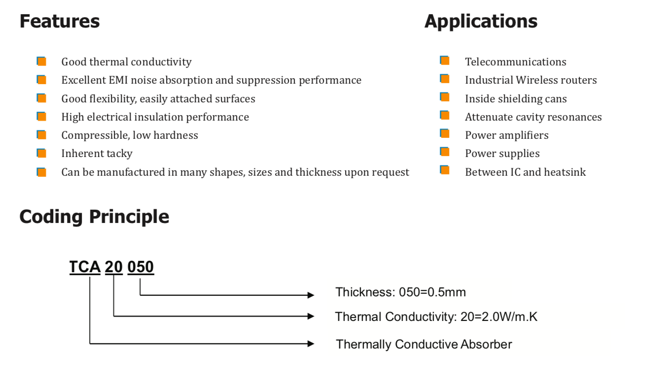 TM TCA系列導(dǎo)熱吸收材料是一種填充陶瓷和鐵氧體顆粒的硅基復(fù)合材料。設(shè)計(jì)用于吸收電磁噪聲(諧振腔、串?dāng)_和耦合)并填充熱界面之間的間隙。TCA系列吸收材料具有自粘性,組裝時(shí)不需要任何膠帶。" />